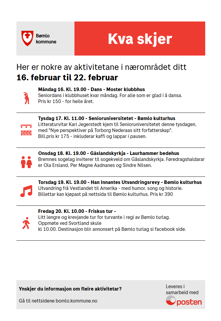 Tema i veke 8 i informasjonsskrivet På døra er portalen Aktivitet for alle. På døra vert av postboda levert ut til eit utval personar over 67 år i Bømlo kommune. I tillegg er det informasjon om ein del aktivitetar som skjer denne veka retta inn mot denne målgruppa. I samarbeid med Posten Bring AS vil Bømlo kommune halda fram pilotprosjektet me starta opp i august i fjor med å testa ut ein ny måte å informera om aktivitetar målgruppa kan delta på. I tillegg vil informasjonen innehalda andre aktuelle lokale og nasjonale tema. Omlag 500 innbyggjarar over 67 år i kommunen er tilfeldig plukka ut som testmottakarar.