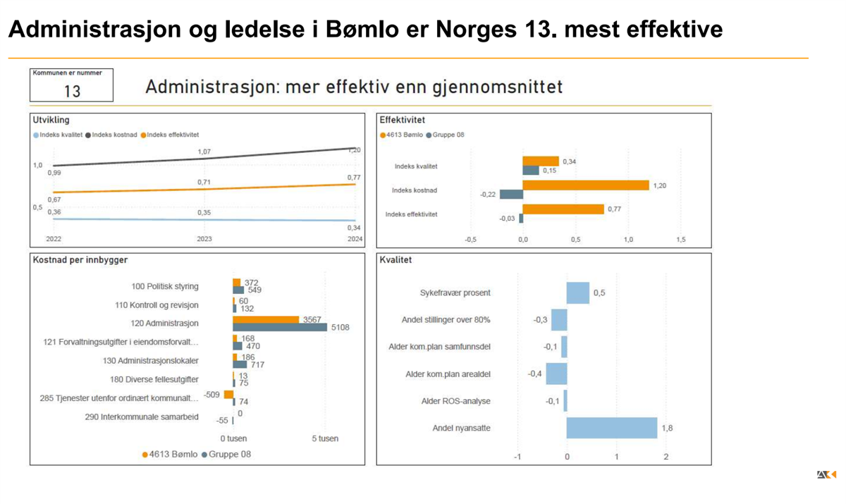 “Norges best styrte kommuner: Kommuneindeksen 2025” er ei samanlikning av norske kommunar, basert på om lag 84 nøkkeltal for kvalitet i tenestene, i tillegg til eigne indikatorar for kostnadar og finansar. Føremålet er å gje beslutningstakarar eit lettfatteleg og empirisk forankra bilete av korleis kommunen presterer som tenesteytar. Indeksen er utvikla av Agenda Kaupang for Storebrand Livsforsikring, og omfattar 16 kommunale tenester som grunnskule, barnehage, helse, pleie og omsorg, brann/redning, samferdsel og administrasjon. Tala er i hovudsak henta frå KOSTRA, med tillegg frå direktorat og andre offisielle kjelder. Tjenestene blir vekta etter kor stor del av kommunens budsjett dei utgjer, og kvalitet, kostnadar og finansar tel like mykje i den samla vurderinga.