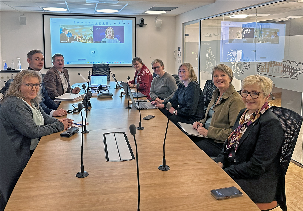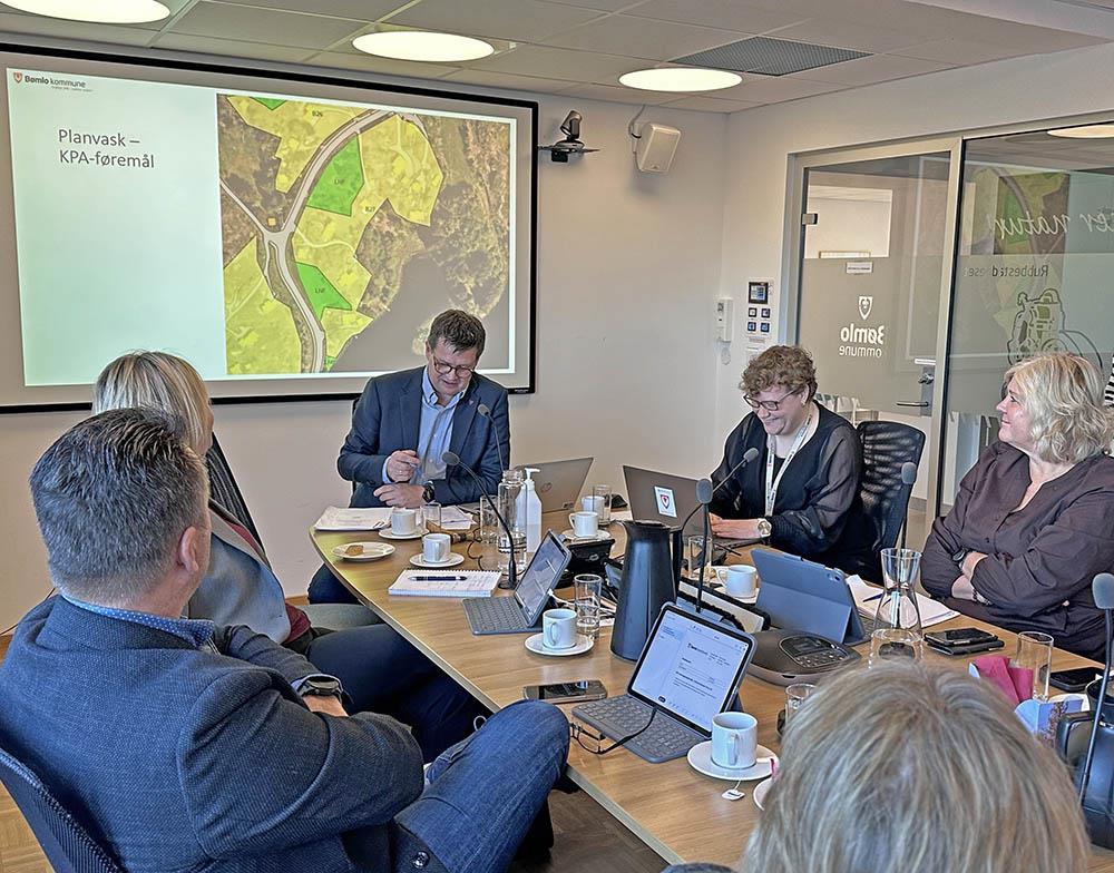 Planvask til etterfølging for andre kommunar meiner statsforvaltar Liv Signe Navarsete (t.h) og Synnøve Stalheim kommunaldirektør etter formøte om Bømlo sitt arbeid med kommunedelen sin arealdel. Frå kommunen deltok formannskapsmedlem Anne T. Johannessen, utvalsleiar for areal og samferdsel Christer Agasøster, ordførar Morten Helland, fagansvarleg arealplan Renate Torkelsen, kommunalsjef samfunnutvikling Tone Stavland og avdelingsleiar arealbruk Lise Notland.