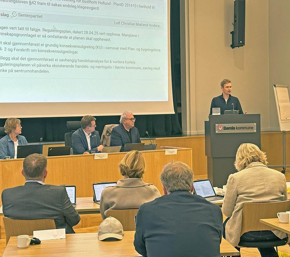 Leif Christian Mæland Andersen fremja på nytt Senterpartiet sitt forslag om å oppheva planvedtaket og ta klagene til fylgje på grunn av det dei meiner var omfattande manglar i kunnskapsgrunnlaget. Sp vil ha gjennomført ei grundig konsekvensutgreiing og ei uavhengig handelsanalyse for å vurdera korleis reguleringsplanen vil påverka eksisterande handels- og næringsliv i Bømlo kommune, særleg med tanke på sentrumshandelen. Leiar i Utval for areal og samferdsel Christer Agasøster meinte vedtaket frå utvalet står seg godt.