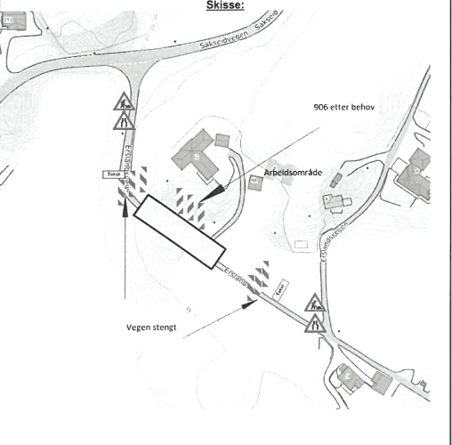 Skisse over gravearbeid som fører til vegstenging på Erslandsvegen.