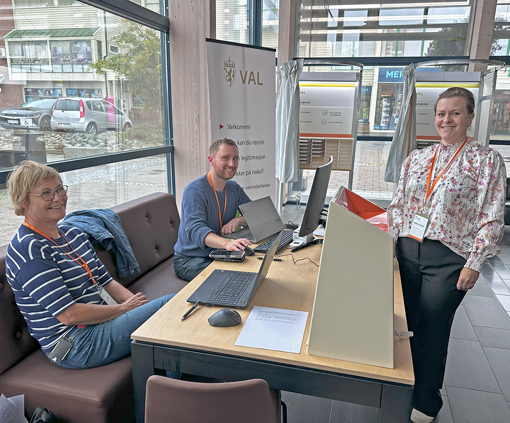 God stemning ved oppstrten av førehandsrøystinga til Stortings- og Sametingsvalet 2025 i Bømlo kulturhus. Frå venstre valansvarleg Bente Sæverud, IKT-rådgjevar Helge Bjørnevik og nestleiar vallokalet Silje Eriksen Oldereide.