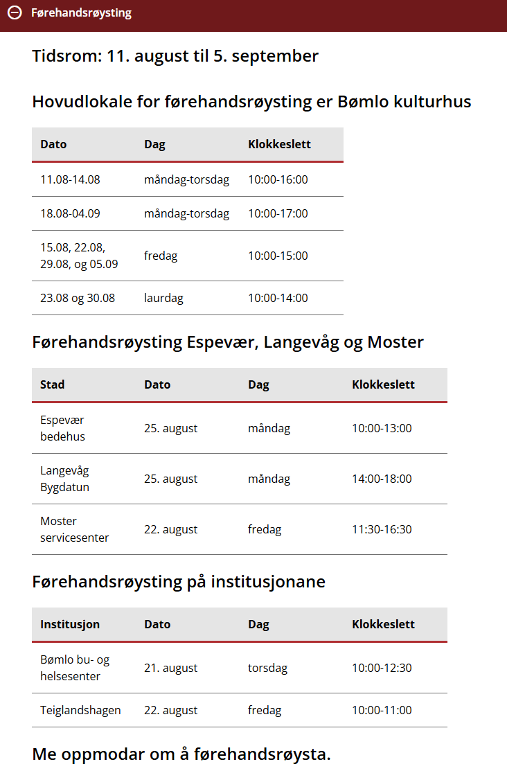 Tid og stad for førehandsrøysting Stortings- og Sametingsvalet 2025 i Bømlo kommune.