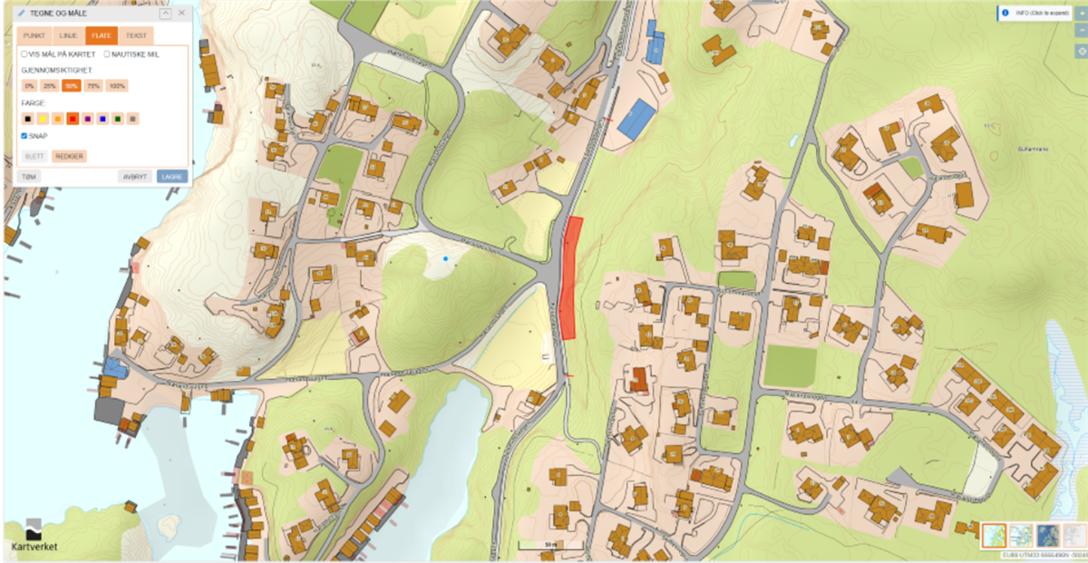 Fjellsikrinsgarbeid ved Fylkesnesvegen illustrert med raudt felt.