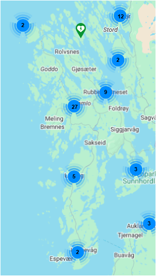 Kart over registrerte hjartestartarar i Bømlo kommune.Difor er også 113-appen fin å lasta ned til mobiltelefonen din, slik at du sjølv lett finn næraste hjartestartar om du treng det.
