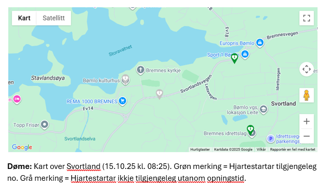 Kart over Svortland (15.10.25 kl. 08:25). Grøn merking = Hjartestartar tilgjengeleg no. Grå merking = Hjartestartar ikkje tilgjengeleg utanom opningstid.