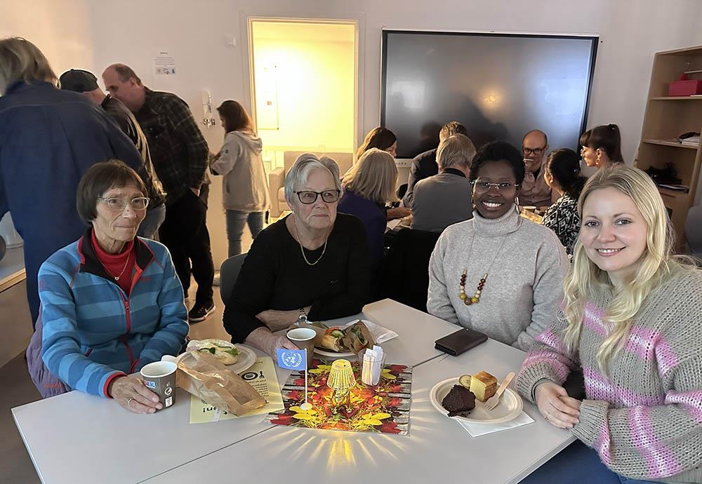 God stemning rundt borda under Bømlo vaksenopplæring sin internasjonale språkkafè til inntekt for årets TV-aksjon. Frå v. Ann Kristin, Heidi, Elianne og Linda Iren.