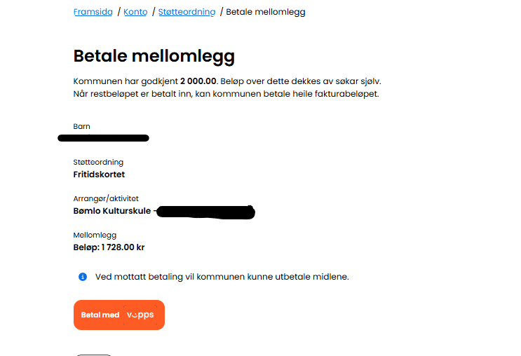 Dersom de vel overføring til lag/organisasjon og fakturaen er på meir enn kr. 2000, må det resterande beløpet betalast av dykk sjølve. Dette kan gjerast via Vipps til Bømlo kommune.