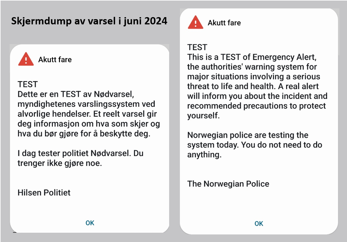 - Teksten i varselet kjem i to språkversjonar - éin norsk og éin engelsk. Kva telefon og kva språkinnstillingar du har, avgjer om du får varselet på norsk, engelsk eller på begge språk.