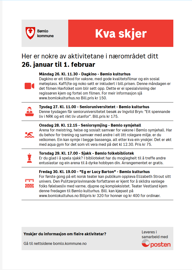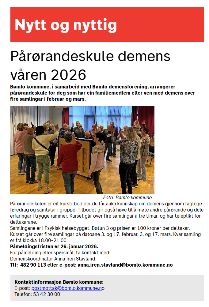 Tema i veke 5 er i informasjonsskrivet På døra er pårørande skule demens 2026. På døra vert av postboda levert ut til eit utval personar over 67 år i Bømlo kommune. I tillegg er det informasjon om ein del aktivitetar som skjer denne veka retta inn mot denne målgruppa. I samarbeid med Posten Bring AS vil Bømlo kommune halda fram pilotprosjektet me starta opp i august i fjor med å testa ut ein ny måte å informera om aktivitetar målgruppa kan delta på. I tillegg vil informasjonen innehalda andre aktuelle lokale og nasjonale tema. Omlag 500 innbyggjarar over 67 år i kommunen er tilfeldig plukka ut som testmottakarar.
