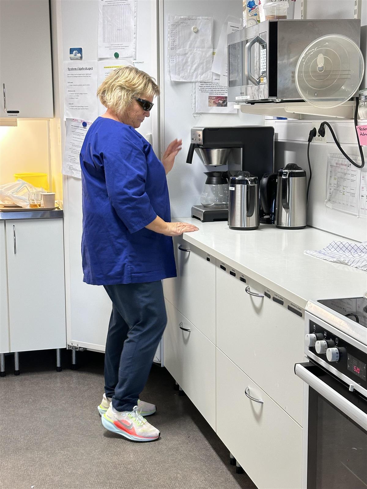 Hildegard Halleraker, utdanna vernepleiar, har også funne sin plass som servicevert. – Eg har i alle år jobba i systemet og kjenner systemet knallgodt. No er eg praktisk blind, og synest det er kjempeflott at dei vågar å satsa på meg. Sjølv om eg klarar det meste, treng eg litt spesiell tilrettelegging på enkelte ting. Fellesskapet du får ved å gå på jobb er utruleg viktig for meg.