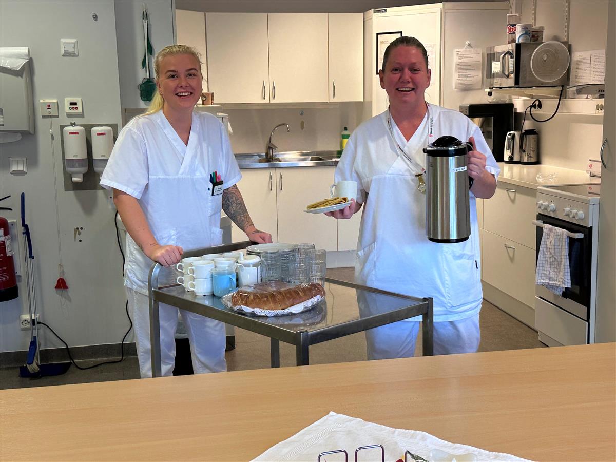 Å servere måltider på BBH er noko sjukepleiarane no ynskjer ein servicevert kan gjere i framtida. God stemning på avdeling Nord når helsefagarbeider Marlen Vorland (t.v) og Anja Nilsson byr på kaker og kaffi.