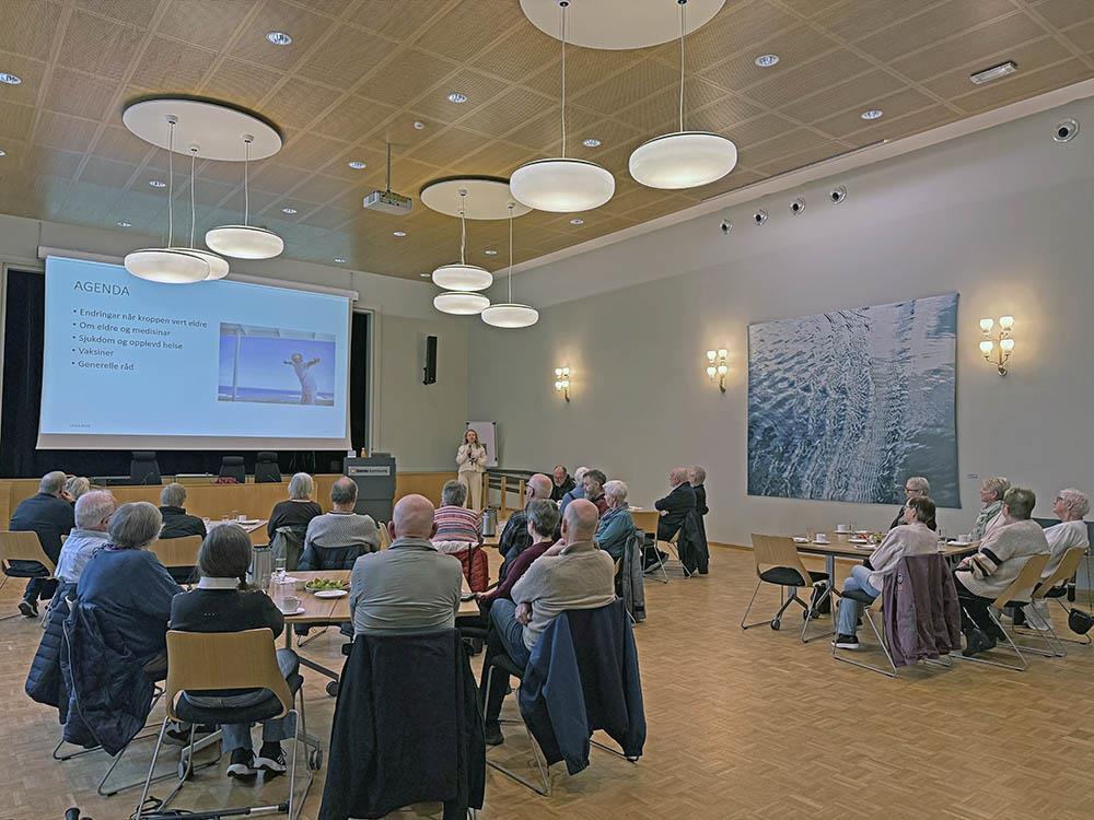 Rehabiliteringskoordinator Solrunn Mæland Jensen ved tenestekontoret synte døme på grep ein kan gjere for å gjere heimen tryggare, og kommuneoverlege Anne Marit Særsten Halvorsen illustrerte endringar som skjer i kroppen, og forklarte kva konsekvensar dette kan ha for den einskilde. Innlegget frå brannforebyggar Bjørn Rhoar Sortland er alltid godt motteke, der han fortel om korleis ein bør trygge eigen heim mot brann.