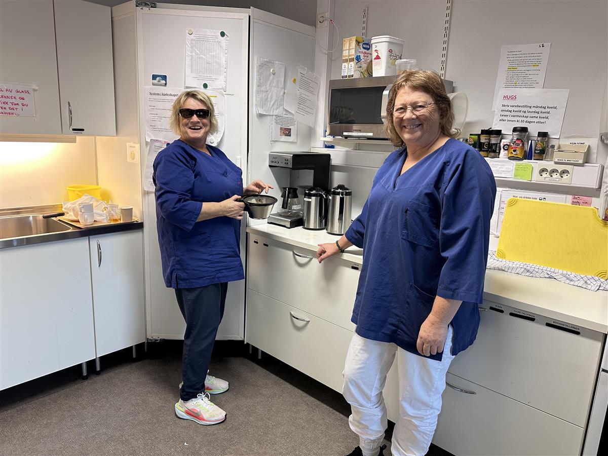 Breie smil og topp stemning på kjøkenet i avdeling 2 Nord på Bømlo bu- og helsesenter der servicevertane Hildegard Halleraker (t.v) og Laila Bø er deltakarar i TØRN-prosjektet.