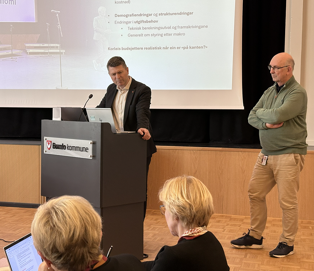 Kommunedirektør Kjetil Aga Gjøsæter og økonomisjef Jarle Nakken tok for seg kommuneøkonomien. Dei peika på svake driftsresultat dei siste åra, lågt disposisjonsfond, negativ prognose for 2025, svikt i fleire inntektsgrunnlag, svak likviditet og behov for likviditetslån for å betala ut løn. - Det er utfordrande, særleg med likviditeten. Likevel er det god driv i ein organisasjon med lite pengar, og me tek grep for a skapa berekraftige einingar og sjå korleis me kan drifta optimalt, understreka Aga Gjøsæter.