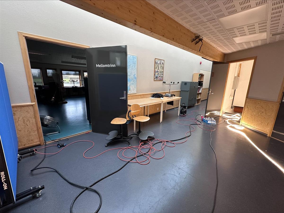 Utlufting av skulebygget på Meling etter branntilløp i teknisk tavlerom i kjellaren, trappa ned til høgre.
