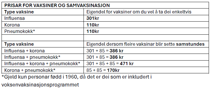 Prisoversikt for vaksiner og samvaksinasjon 2025/2026.*Gjeld kun personar fødd i 1960, då det er dei som er inkludert i voksenvaksinasjonsprogrammet