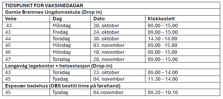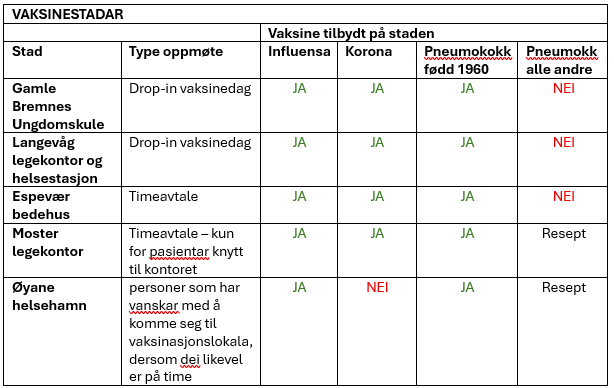 Oversikt over vaksinestader i Bømlo haust/vinter 2025/2026.