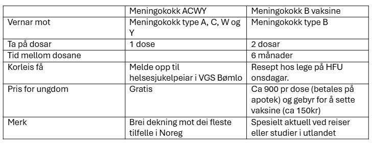 Det finst to ulike vaksinar mot meningokokksjukdom. Dersom du ynskjer å beskytte deg mot alle typar meningokokksjukdom må du ta begge vaksiner.