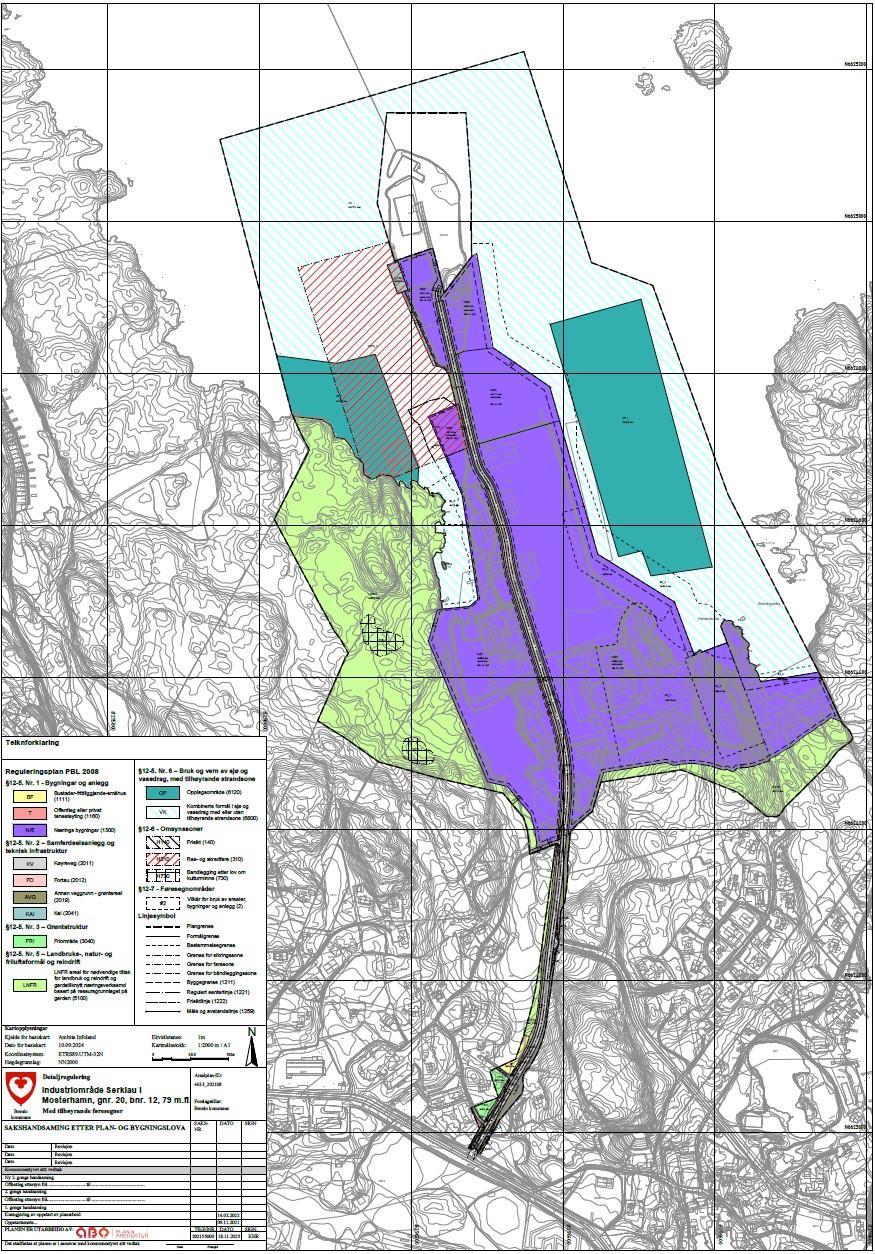 Plankartet til vedtatt planDet overordna føremålet med planarbeidet er å leggje til rette for etablering av næringsareal med tilhøyrande teknisk infrastruktur. Planen opnar for relativt omfattande utfyllingar i sjø, både på aust- og søraustsida samt i sørvest.